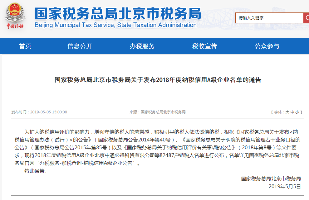 2019年5月5日,為擴大納稅信用評價的影響力,增強守信納稅人的榮譽感,積極引導納稅人依法誠信納稅,國家稅務總局北京市稅務局發(fā)布了2018年度納稅信用A級企業(yè)名單。