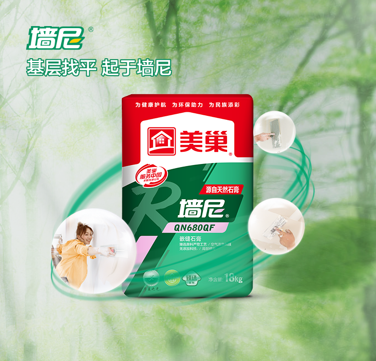 墻尼QN680QF嵌縫石膏是一種墻面修補(bǔ)材料。臻選原料,嚴(yán)苛工藝,和易性好、易施工、凝結(jié)硬化快、粘結(jié)強(qiáng)度高、收縮變形小、不開裂。適用于修補(bǔ)室內(nèi)孔洞、溝槽及嵌縫,也適用于較平整的混凝土、磚混砂漿墻面和頂棚局部找平,不適用縫隙寬度小于2mm的嵌縫修補(bǔ)。