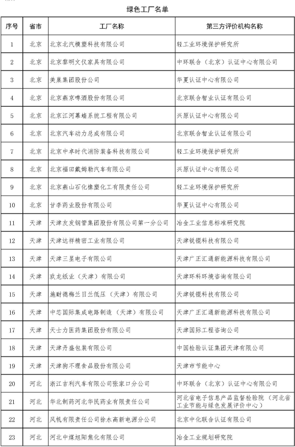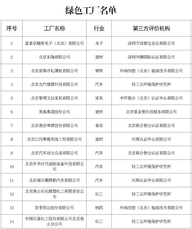 北京市綠色工廠名單